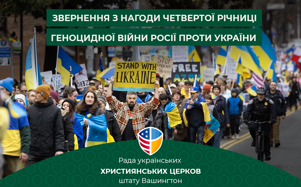 Рада українських християнських церков штату Вашингтон підносить свій голос та наші щоденні молитви на підтримку народу України, який вже дванадцять років протистоїть несправедливій російській агресії та виборює свою свободу, суверенітет та право на існування. Минулі чотири роки повномасштабного вторгнення Росії були особливо важкими для українців, однак засвідчили для всього світу ключовий факт – народ України є та буде існувати як суверенна нація та спільнота вільних людей.